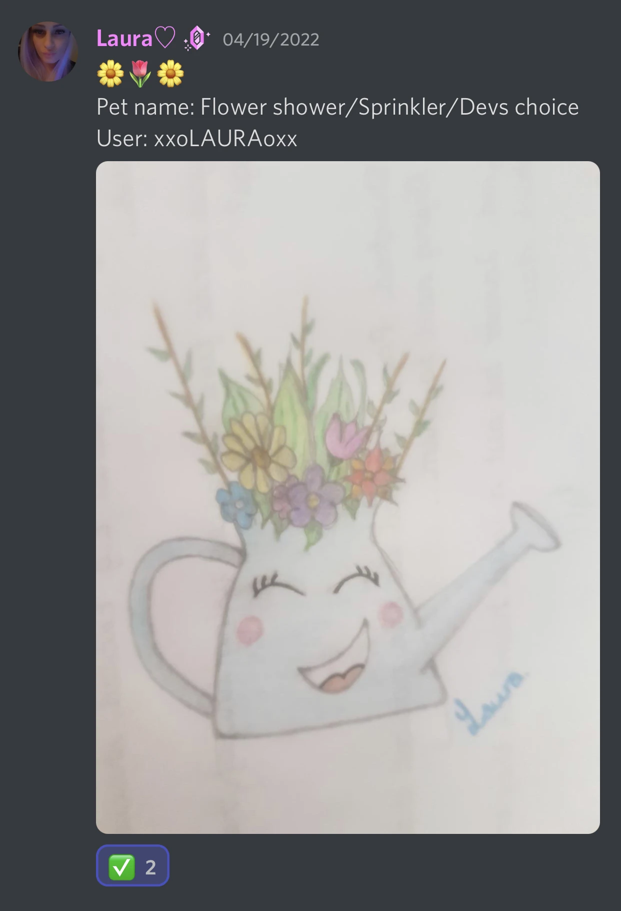 | Unknown (original concept named 'Flower Shower') | New Pet. It resembles a watering can with flowers growing inside. Designed by xxoLAURAoxx. | Discord Server |