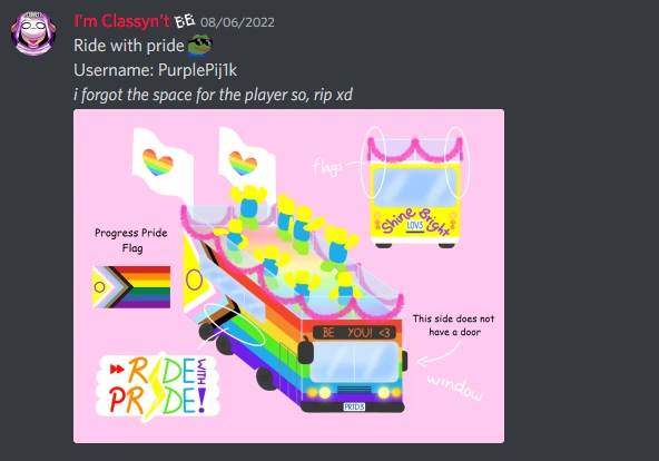 | Pride Bus | New Board. It is a bus themed around the Progress pride flag. Designed by PurplePij1k, modeled by ImJustNato. | Discord Server, Twitter |