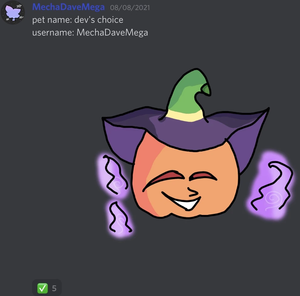 | Unknown | New Halloween Pet. It resembles a smiling pumpkin with a witches hat, along with three pastel-purple flames. Designed by MechaDaveMega. | Discord Server |
