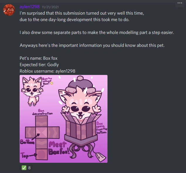 | Unknown (original concept named 'Box Fox') | New Pet. It is a literal fox in a box. Designed by aylen1298. | Discord Server |