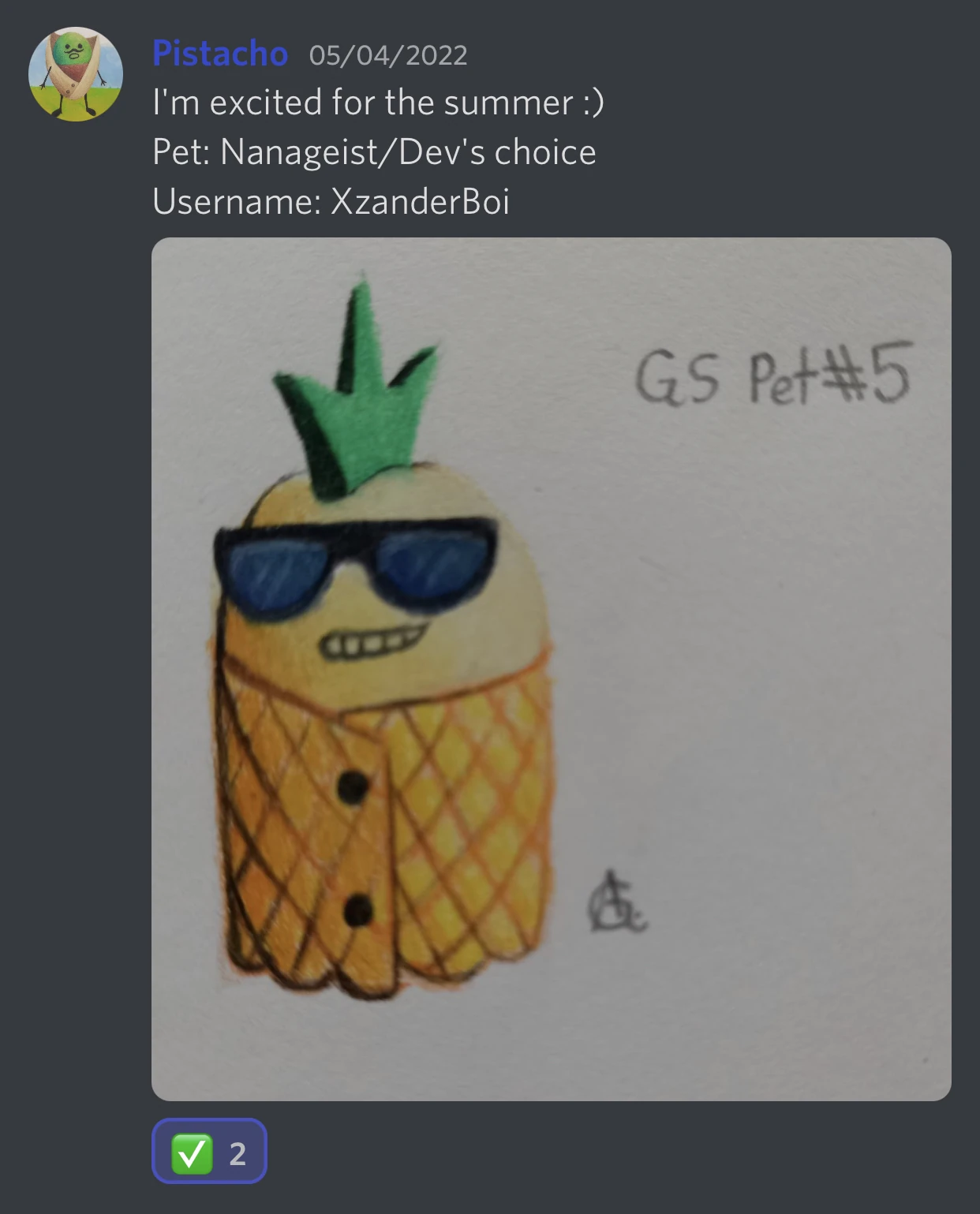 | Unknown (original concept named 'Nanageist') | New Pet. It is a pineapple wrapped in its skin as a towel, with sunglasses and it's leaves for a mohawk. Designed by XzanderBoi. | Discord Server |