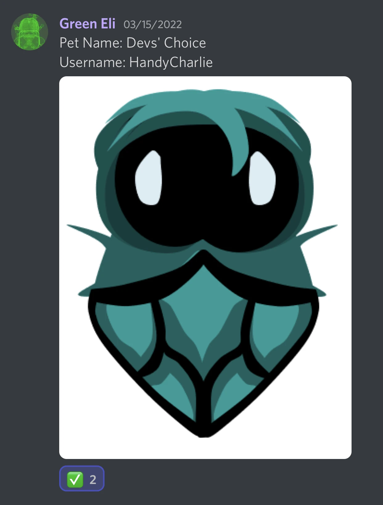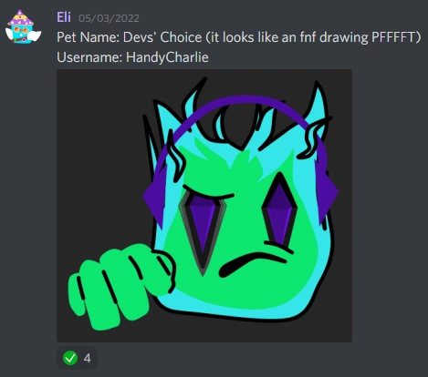 | Unknown | New Pet. It is a green-blue flame that's frowning, with purple headphones. It also has a hand. Designed by Eliquial. | Discord Server |