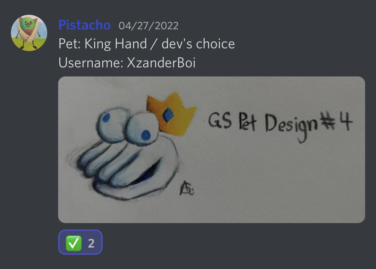 | Unknown (original concept named 'King Hand') | New Pet. It resembles a hand with a crown and crosseyes. Designed by XzanderBoi. | Discord Server |