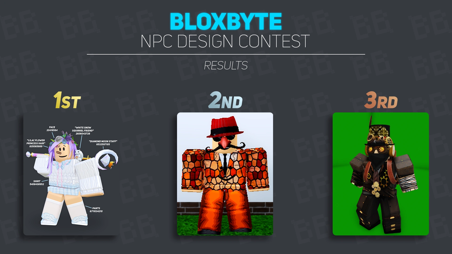 - Concept Artwork that has been approved (usually with a checkmark reaction) by MakkieMon in the BloxByte Games Discord Server.