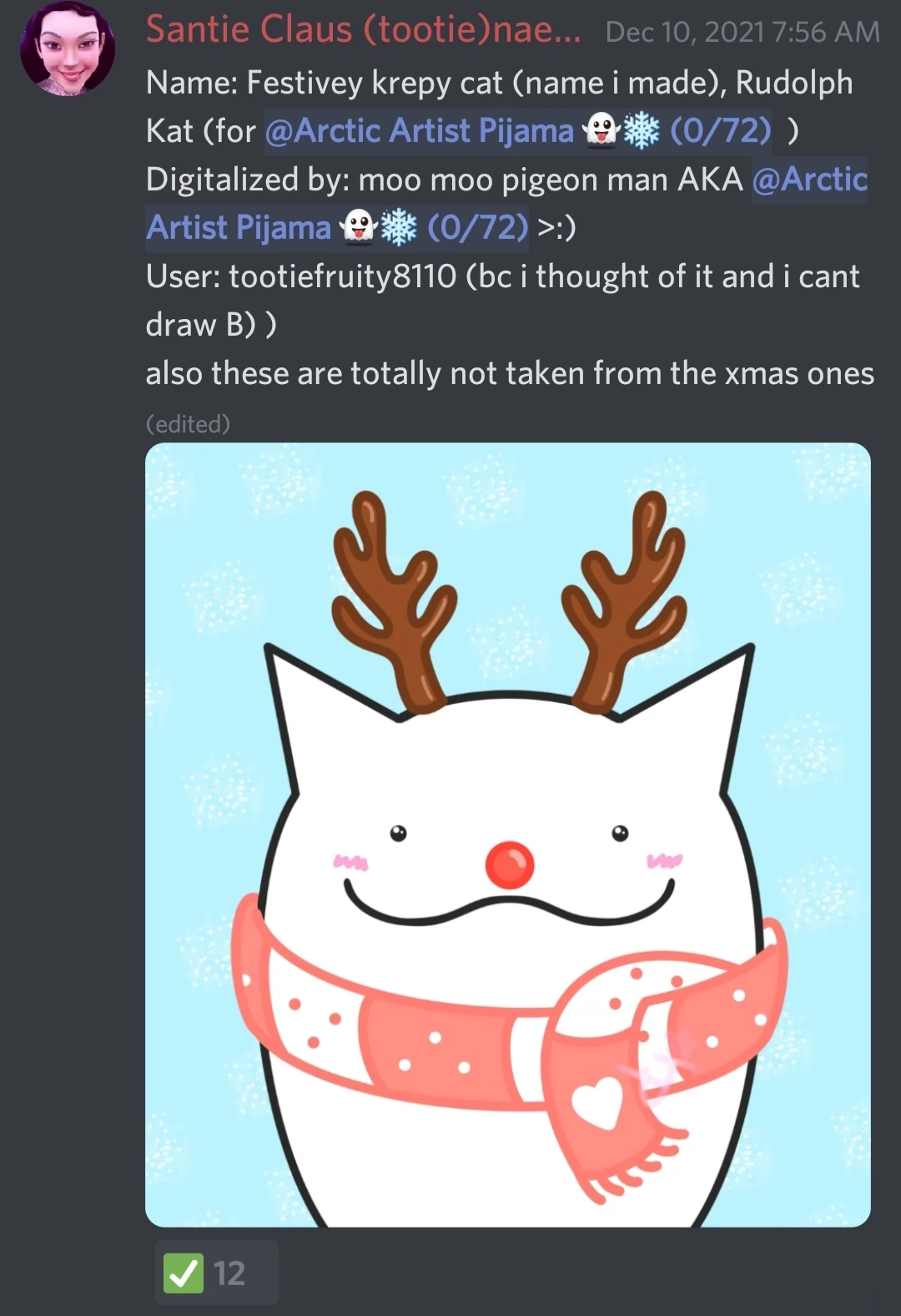 | Unknown (original concept named 'Festivity Krepy Cat') | New Pet. Resembles Krepy Cat with reindeer antlers, a red nose, and a red-white scarf. Designed by PurplePij1k. | Discord Server |