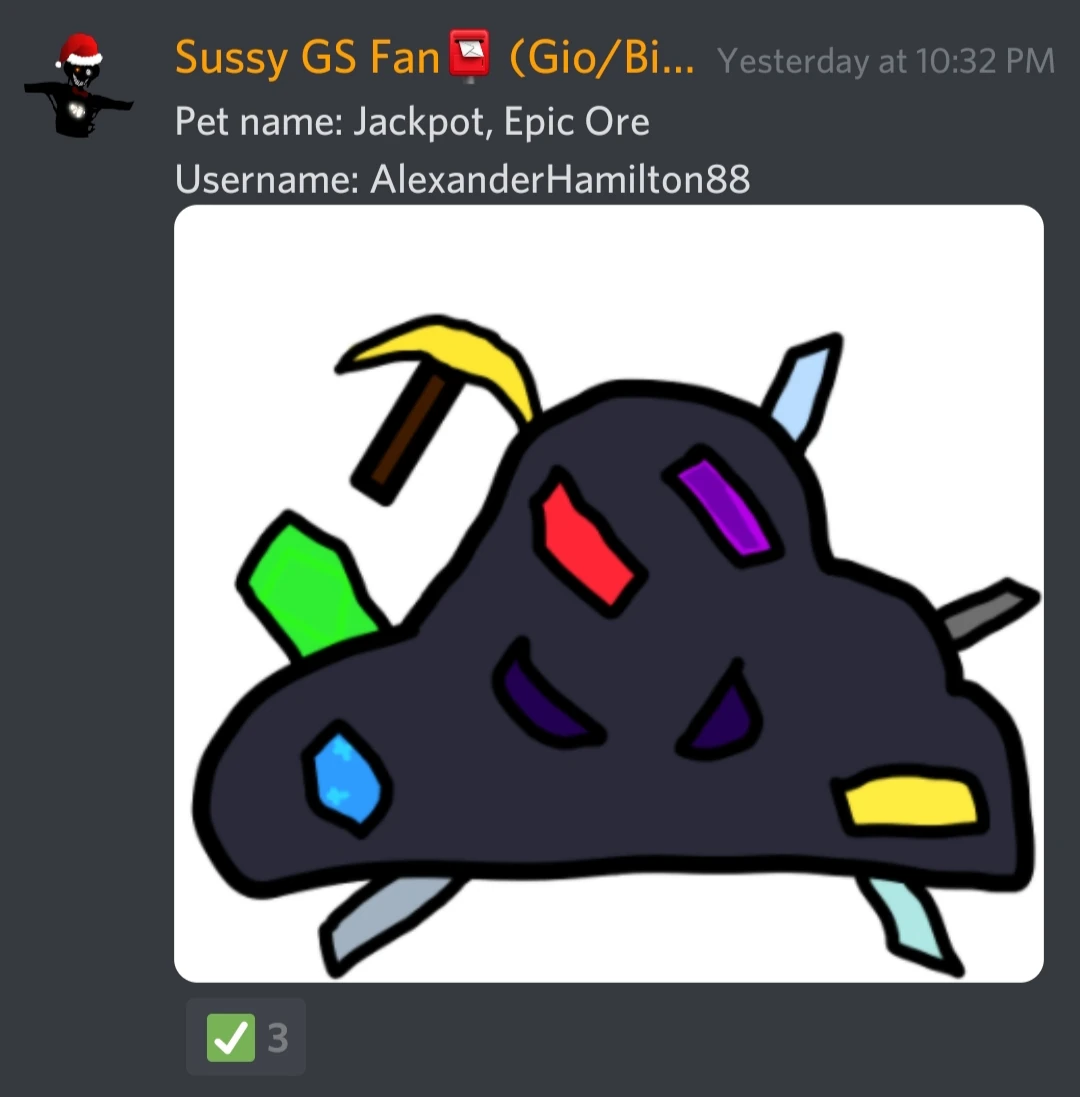 | Unknown (original concept named 'Jackpot' and/or 'Epic Ore') | New Pet. Resembles a rock ore with crystals of all different colors inside. Designed by AlexanderHamiltion88. | Discord Server |