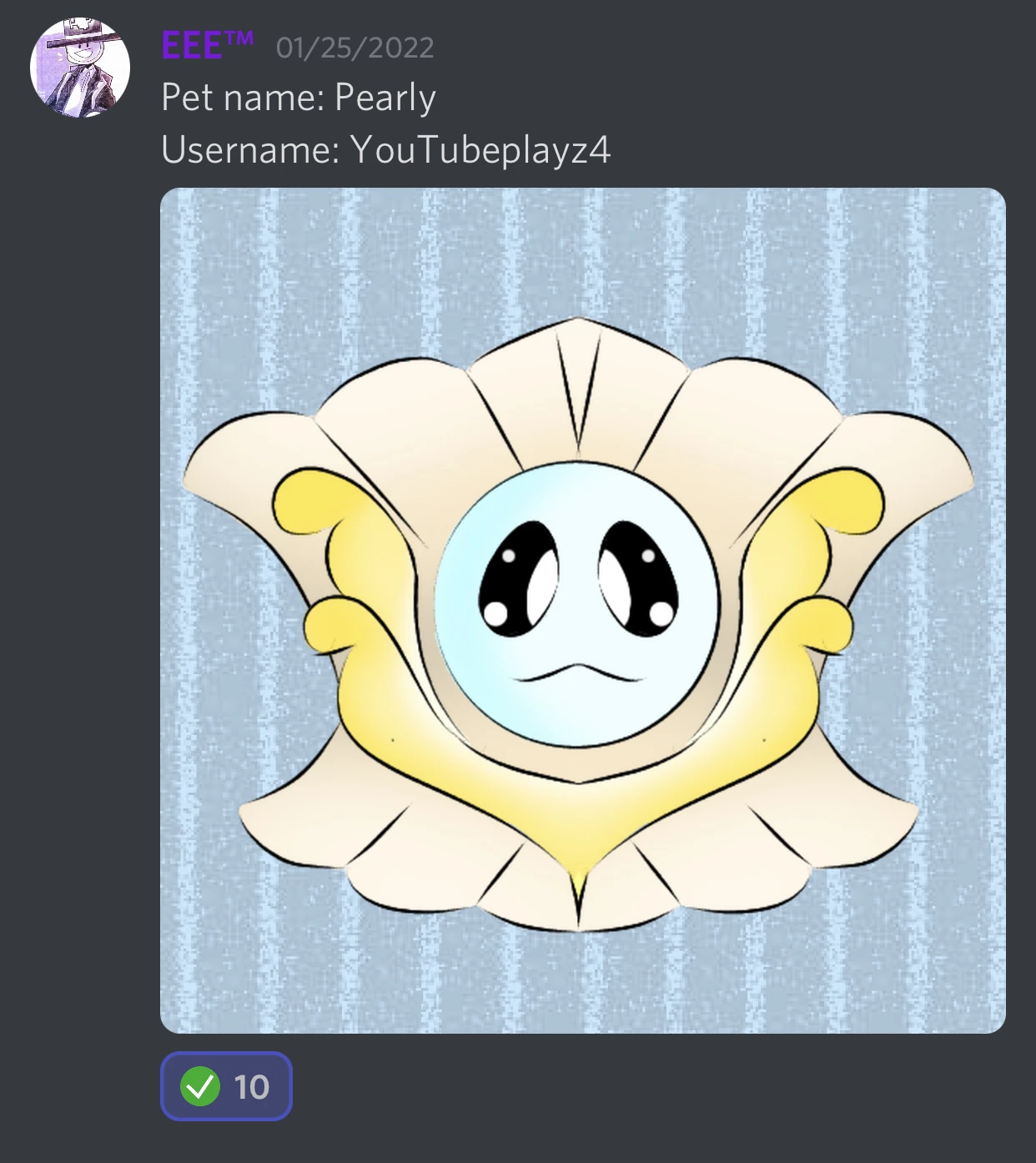 | Unknown (original concept named 'Pearly') | New Pet. Both images may not be the same pet, but they are both oysters with pearls inside. Designed by Youtubeplayz4. | Discord Server, Twitter |