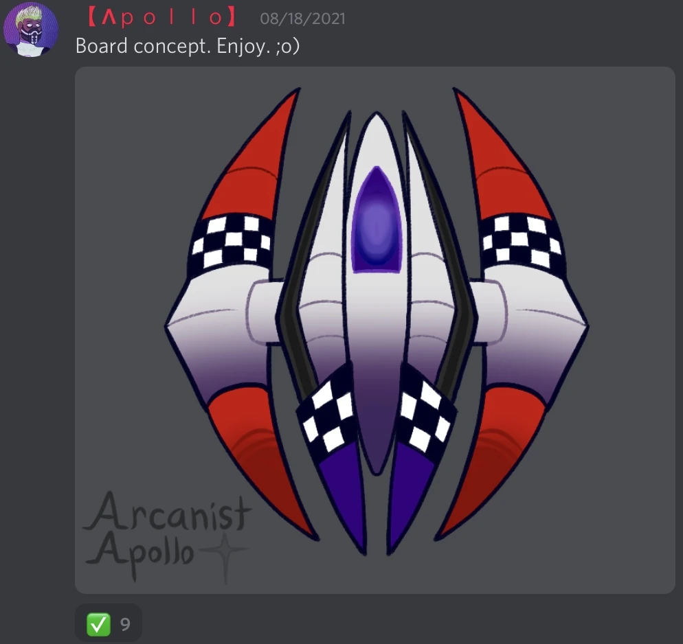 | Unknown | New Board. It seems to be a rocket decorated with checkerboard patterns and red, often associated with racing. Designed by ArcanistApollo. | Discord Server |