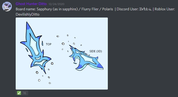 | Unknown (original concept named 'Sapphury/Sapphire') | New Board. It's a blue, icy board with snow particles. Designed by DevilishlyDitto. | Discord Server |