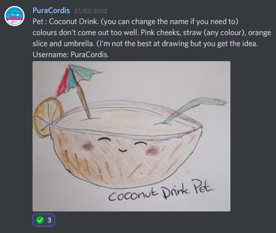 | Unknown (original concept named 'Coconut Drink') | New Pet. It resembles a half-open coconut with coconut milk, with a drink umbrella and straw in it. Designed by PuraCordis. | Discord Server |